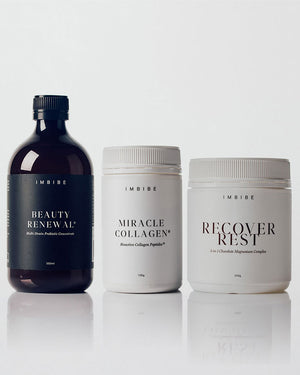 This bundle features our most potent formulations: Miracle Collagen to boost skin structure and elasticity, Beauty Renewal to nourish the gut and microbiome, and CALM/SLEEP or RECOVER REST to soothe even the most stressed system and support sleep.